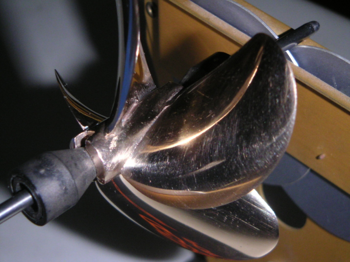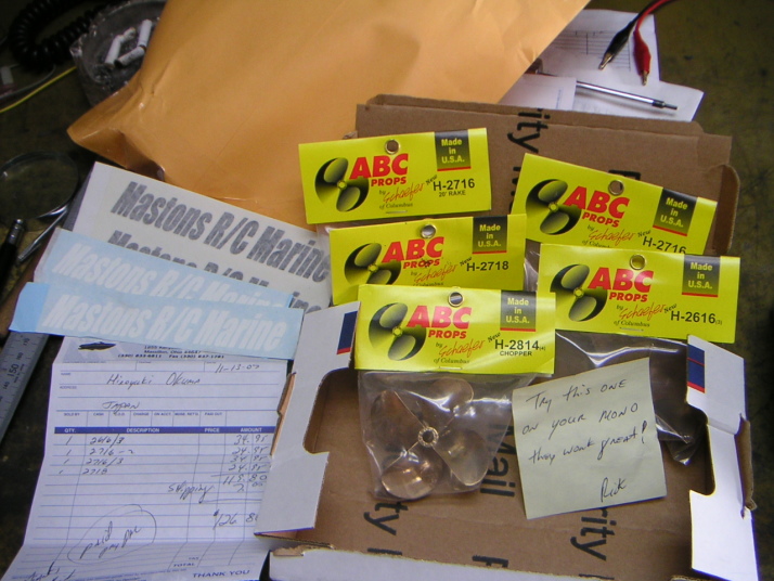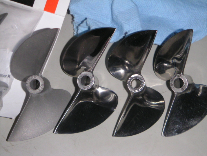 | 本日は、プロペラの紹介、冬場の暇な時に仕上げますペラは、プレッサーのS-275とABCペラ 左側画像の説明:仕上げ前の状態。ノーマルデザインの仕上げ状態。モデフィット済ませた状態(モノ艇用)。 参考に270ぺラン画像 ABCペラ4個注文していましたが4枚ペラが無料で付いていました右側画像に有りますように、 お前のモノに使うと良い働きするぞ〜て書いてありました。 お〜 リック有難う、でもね このABCのペラはバリが多く大変でした それに4枚羽は間が狭いのでそぎ落とすのに手間がかかりすぎる もし、壊したらいくら良くても仕上げる気力がない、二度と作業したくない4枚ペラ、 やっぱ素人がやるには2枚か3枚までやね。 |
